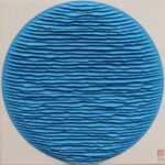 Il déchire tout d’abord les feuilles de papier, à la main pour en faire des bandes organiques et irrégulières, ou à l’aide d’un cutter pour une découpe plus stricte. Il les dispose et les colle ensuite de manière ordonnée sur le support, suivant un schéma de composition qu’il a préalablement dessiné au crayon sur la toile. Les bandes sont pliées en deux dans le sens de la longueur et collées sur la toile par l’une des faces, laissant la seconde virevolter légèrement à la surface, créant un jeu d’ombres et de matière absolument hypnotique.