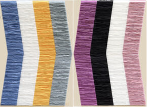 Il déchire tout d’abord les feuilles de papier, à la main pour en faire des bandes organiques et irrégulières, ou à l’aide d’un cutter pour une découpe plus stricte. Il les dispose et les colle ensuite de manière ordonnée sur le support, suivant un schéma de composition qu’il a préalablement dessiné au crayon sur la toile. Les bandes sont pliées en deux dans le sens de la longueur et collées sur la toile par l’une des faces, laissant la seconde virevolter légèrement à la surface, créant un jeu d’ombres et de matière absolument hypnotique.