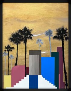 Pour créer ses motifs de palmier, Hubert transpose au Posca (marqueur de peinture d’un noir très profond), à main levée, les arbres trouvés en photo au gré de ses recherches. Il agence ensuite sa composition, parfois très minimaliste avec un ou deux palmiers, d’autres fois plus fournie ou agrémentée d’éléments d’architecture notamment dans ses dernières séries réalisées à la peinture à l’huile. D’autres fois encore, un quadrillage ou des lignes horizontales viennent fragmenter l’espace. Son travail évolue au gré de ses envies et les paysages, toujours tirés de son imagination, nous surprennent sans cesse.