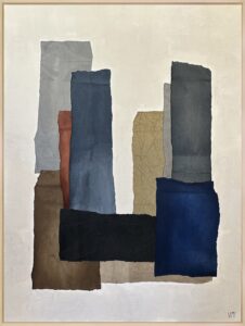 Puis, elle utilise l’encre pour travailler des papiers japonais et coréens et apporter ainsi des nuances et de la transparence dans des aplats de couleurs plus vives (terre de Sienne, ocres, indigo…). Elle réfléchit ensuite à leur disposition pour composer des paysages imaginaires ; le tout constitue alors un ensemble équilibré et apaisant, jouant sur les caractéristiques de chacune des techniques employées. L’association de couleurs est toujours primordiale pour elle.