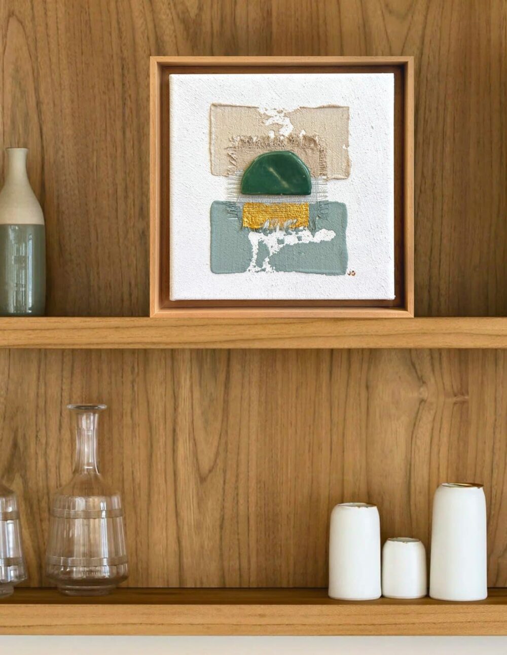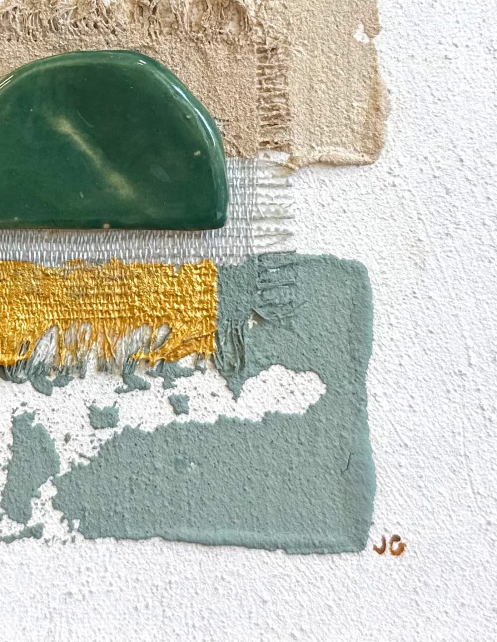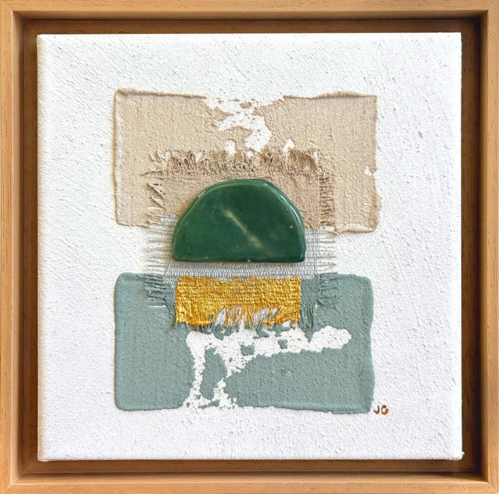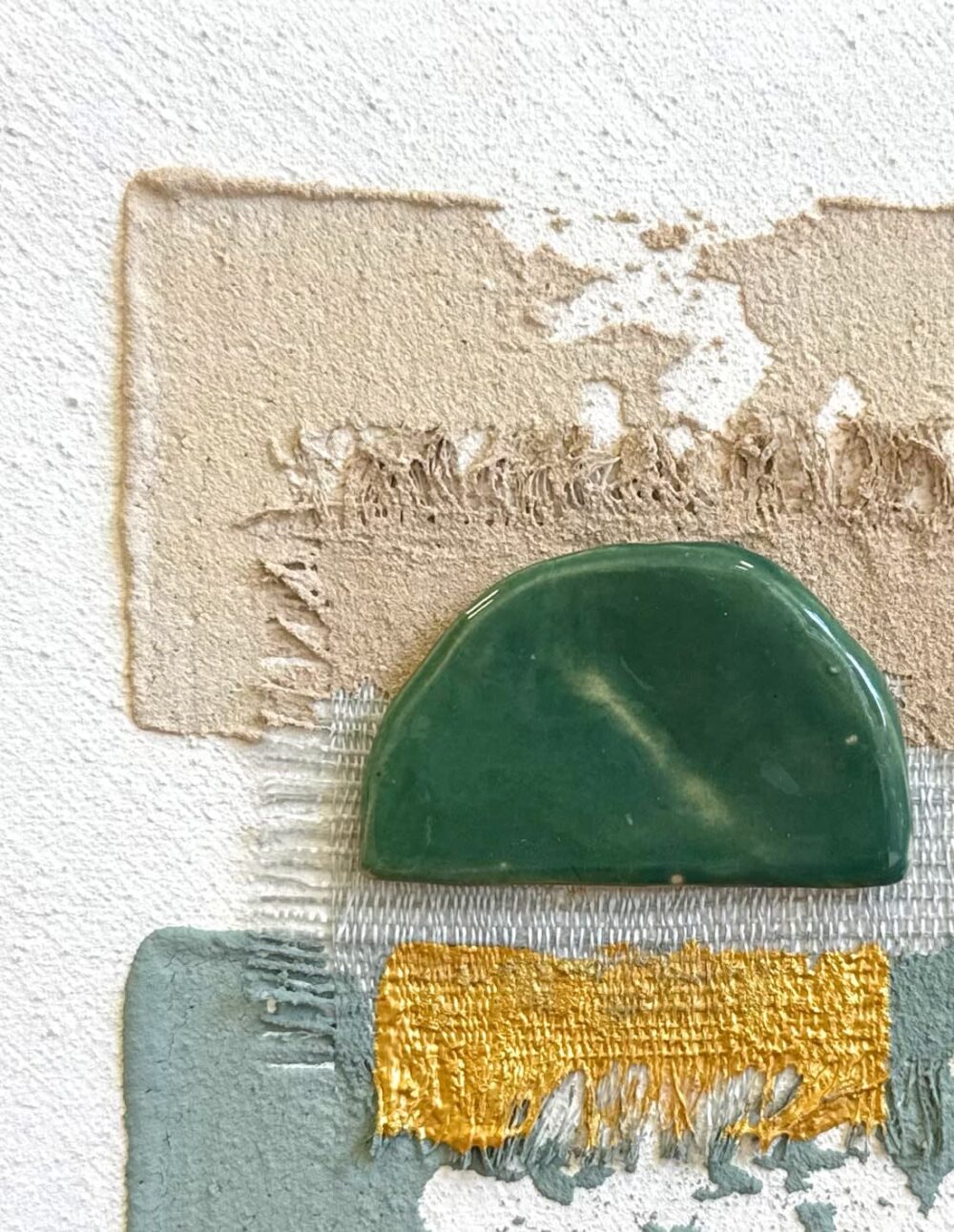 Peinture à la chaux et acrylique, pièce en céramique unique réalisée par l’artiste, soie sauvage, eau de mer & sable de sur chassis entoilé