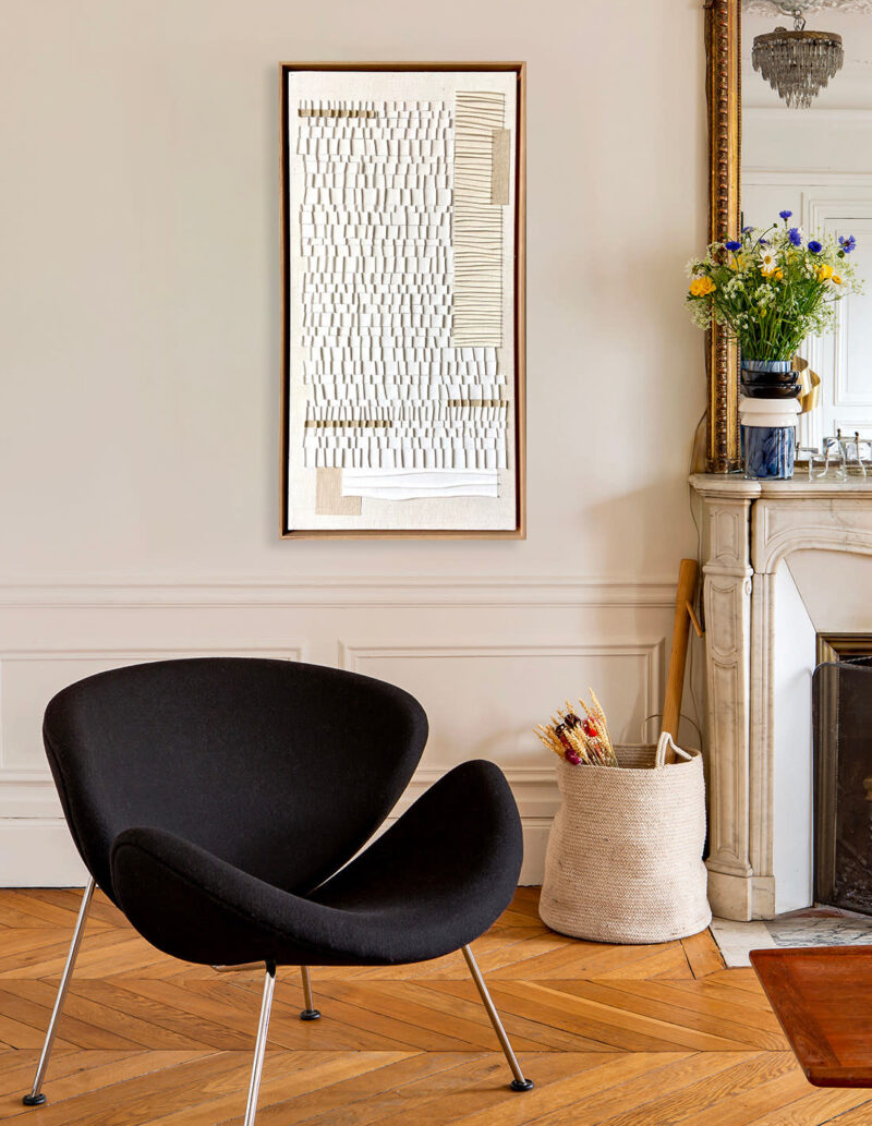 Textiles anciens en lin, gaufrés et empesés, collés sur toile recyclée et châssis bois