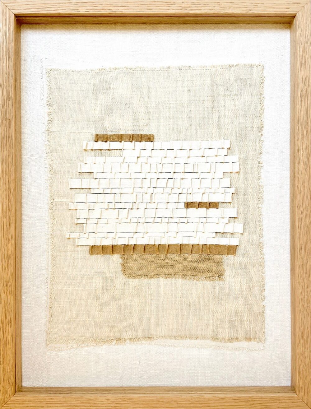 Textiles anciens en lin, gaufrés et empesés, pièces teintées au brou de noix, collés sur toile recyclée et châssis bois