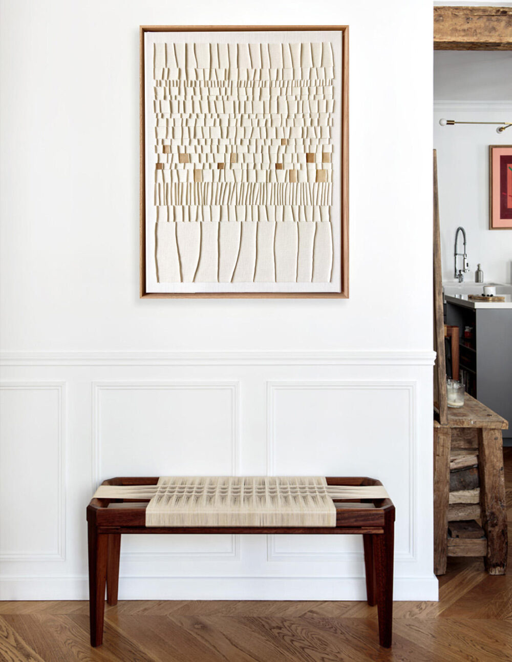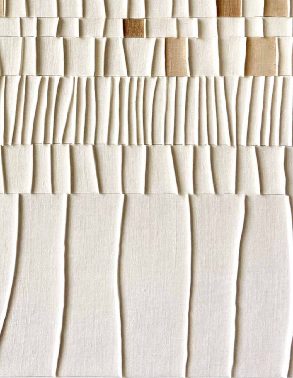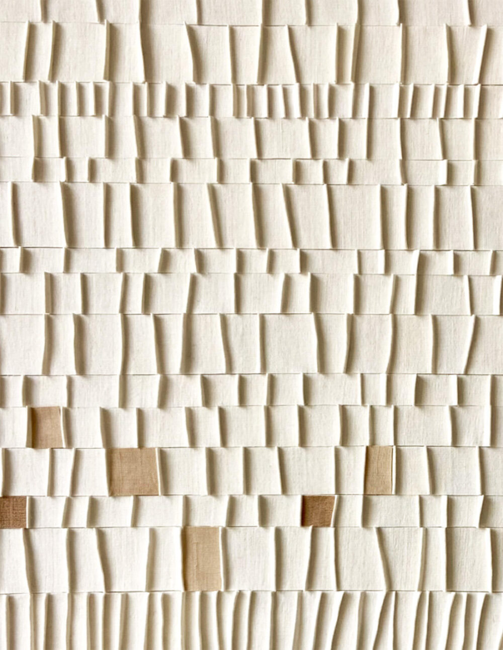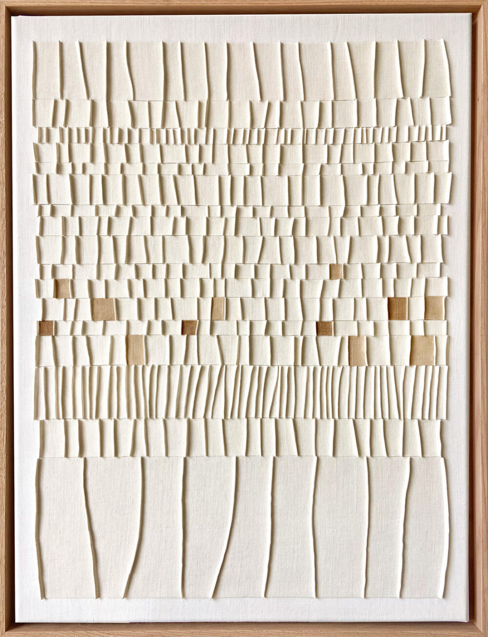 Textiles anciens en lin, gaufrés et empesés, pièces teintées au brou de noix, collés sur toile recyclée et châssis bois
