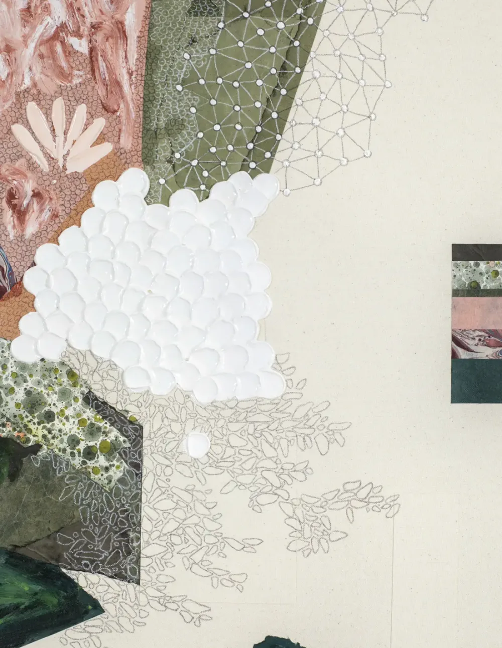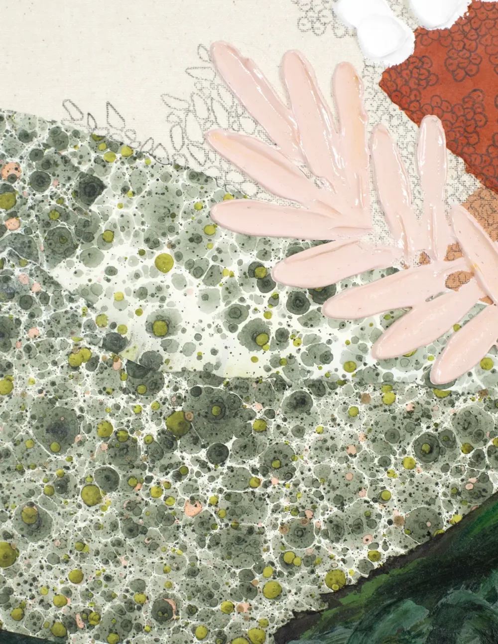 Technique mixte : collage papier, acrylique, posca, pastels à l’huile et crayon papier sur toile