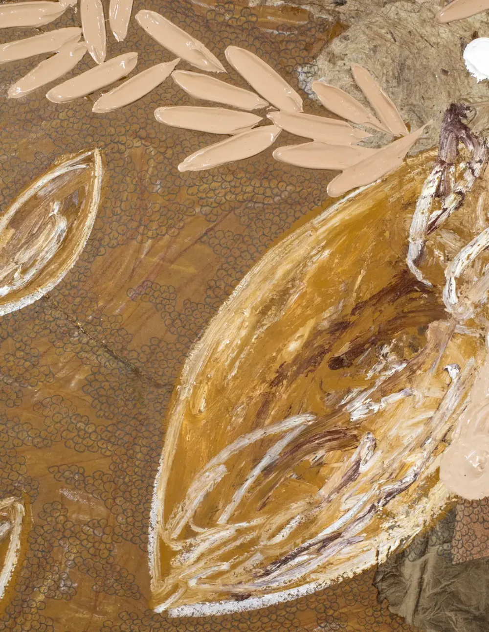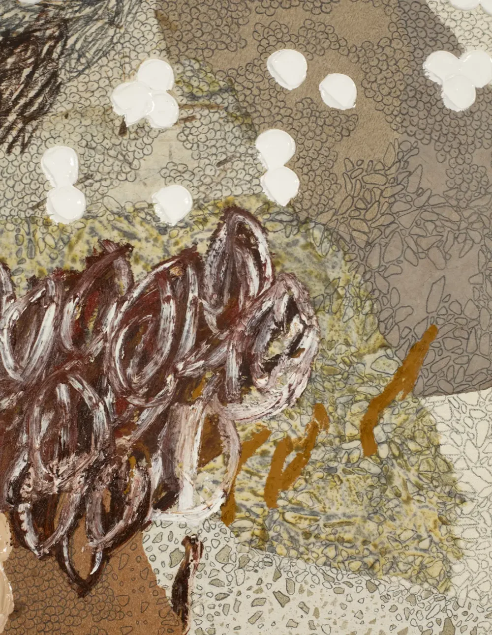 Technique mixte : collage papier, acrylique, posca, pastels à l’huile et crayon papier sur toile