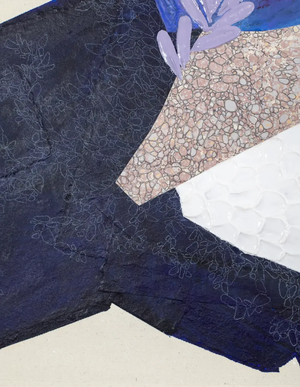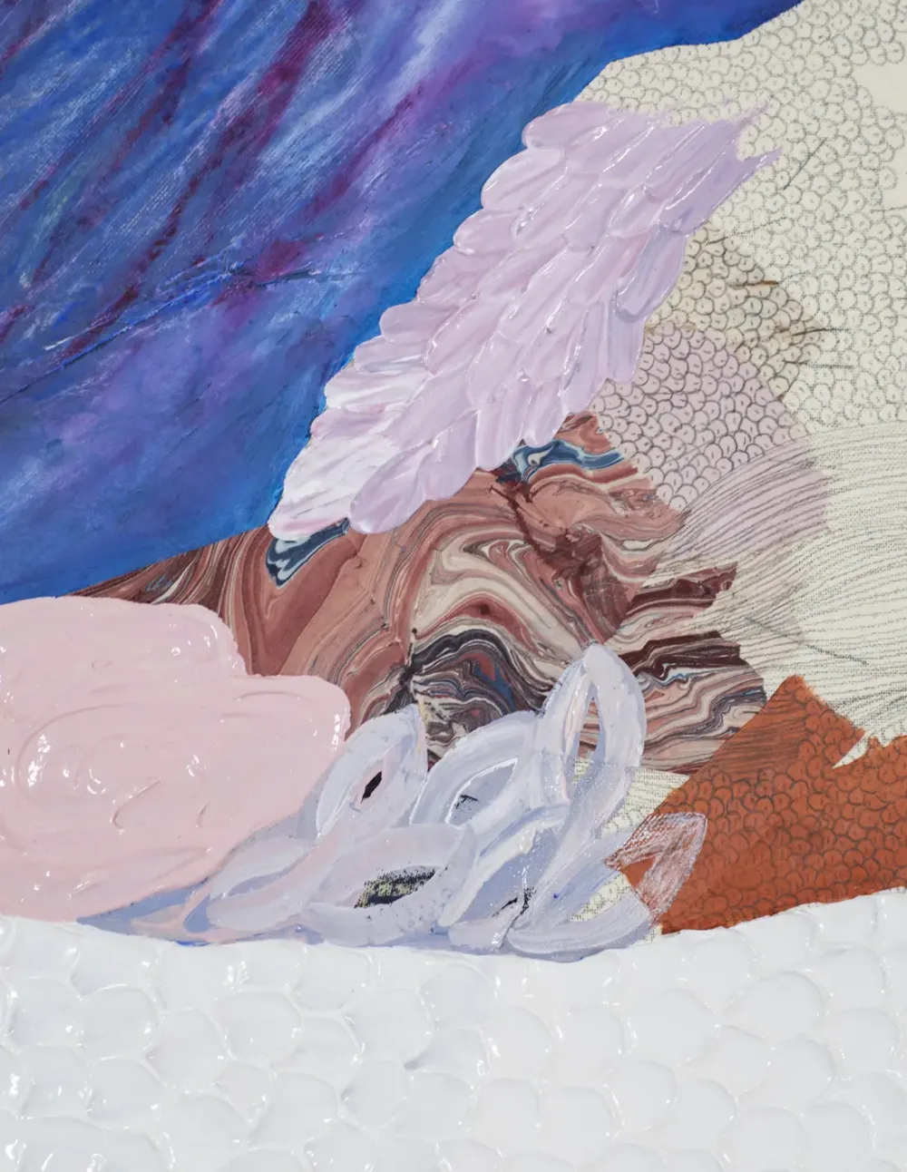 Technique mixte : collage papier, acrylique, posca, pastels à l’huile et crayon papier sur toile