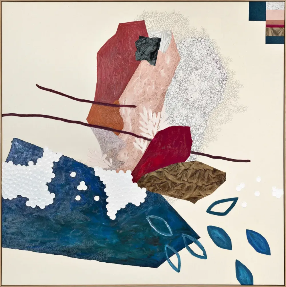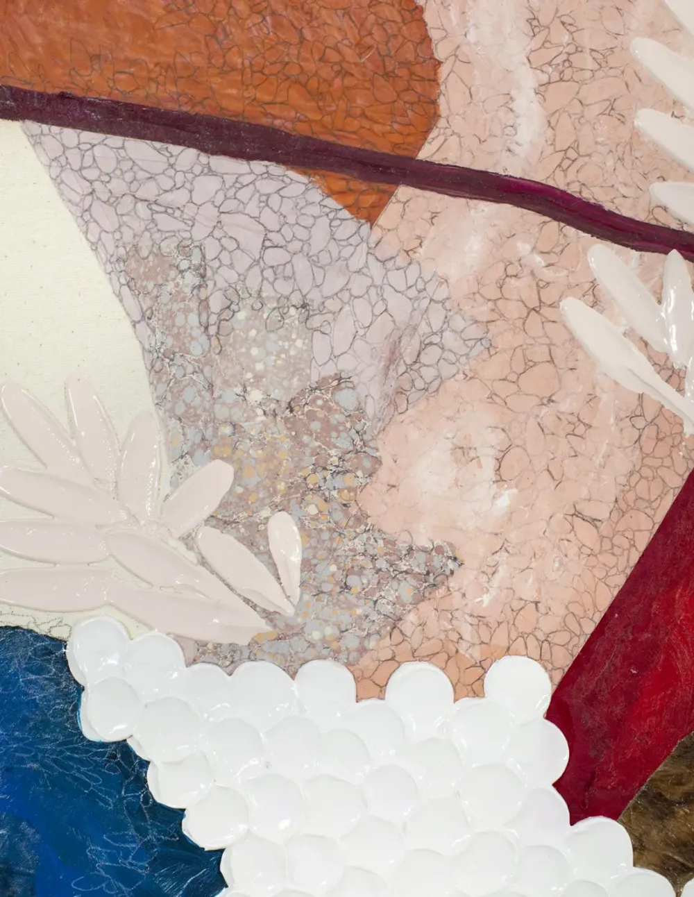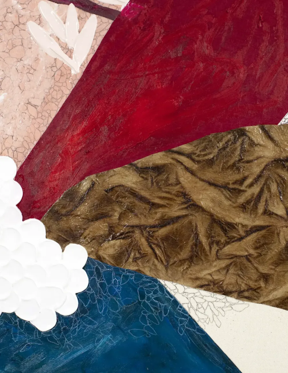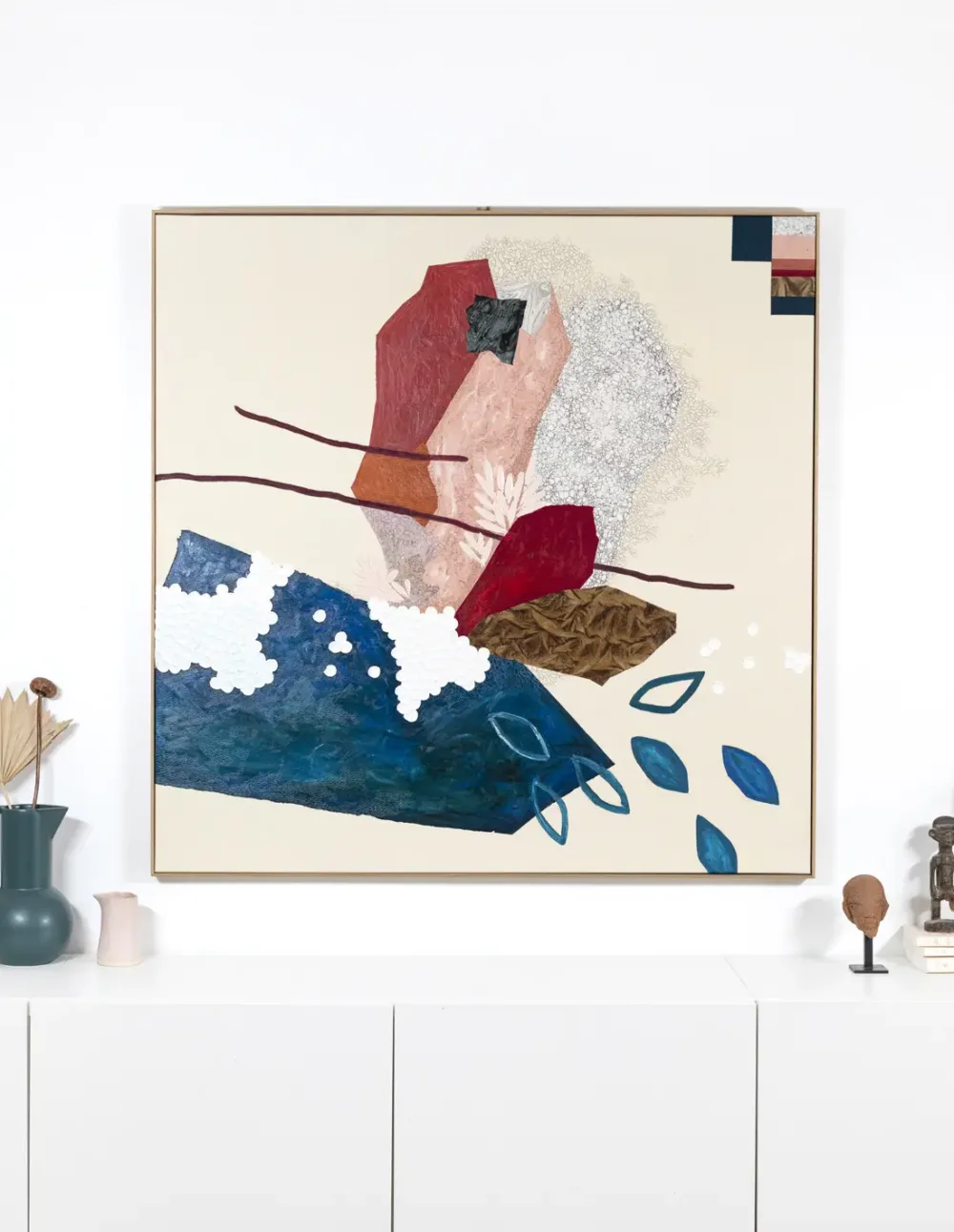 Technique mixte : collage papier, acrylique, posca, pastels à l’huile et crayon papier sur toile