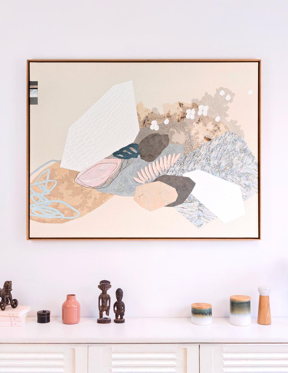 Technique mixte : collage papier, acrylique, posca, pastels à l’huile et crayon papier sur toile