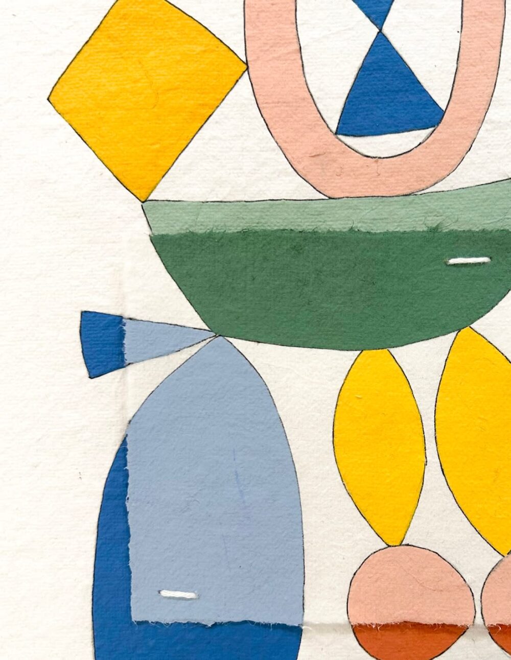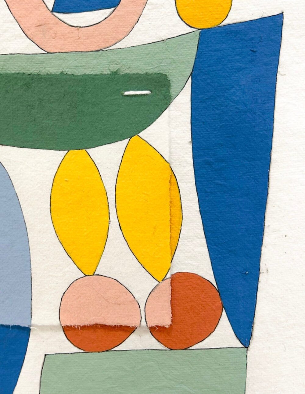Peinture acrylique, crayon et fil de coton cousu sur papier chiffon en coton