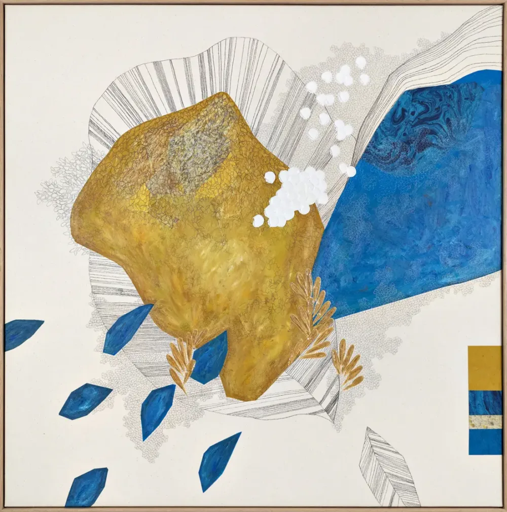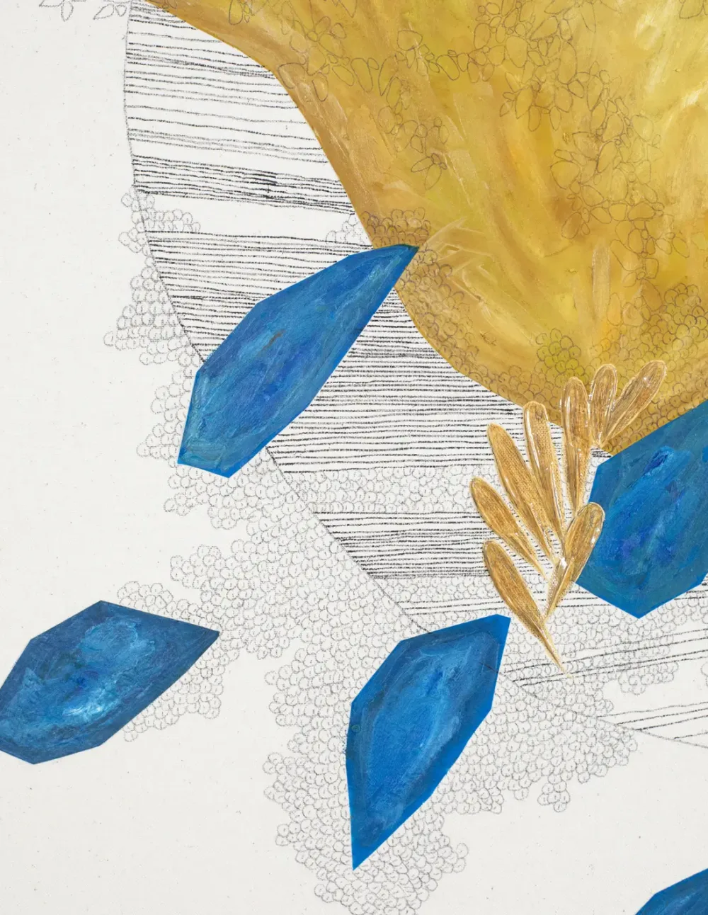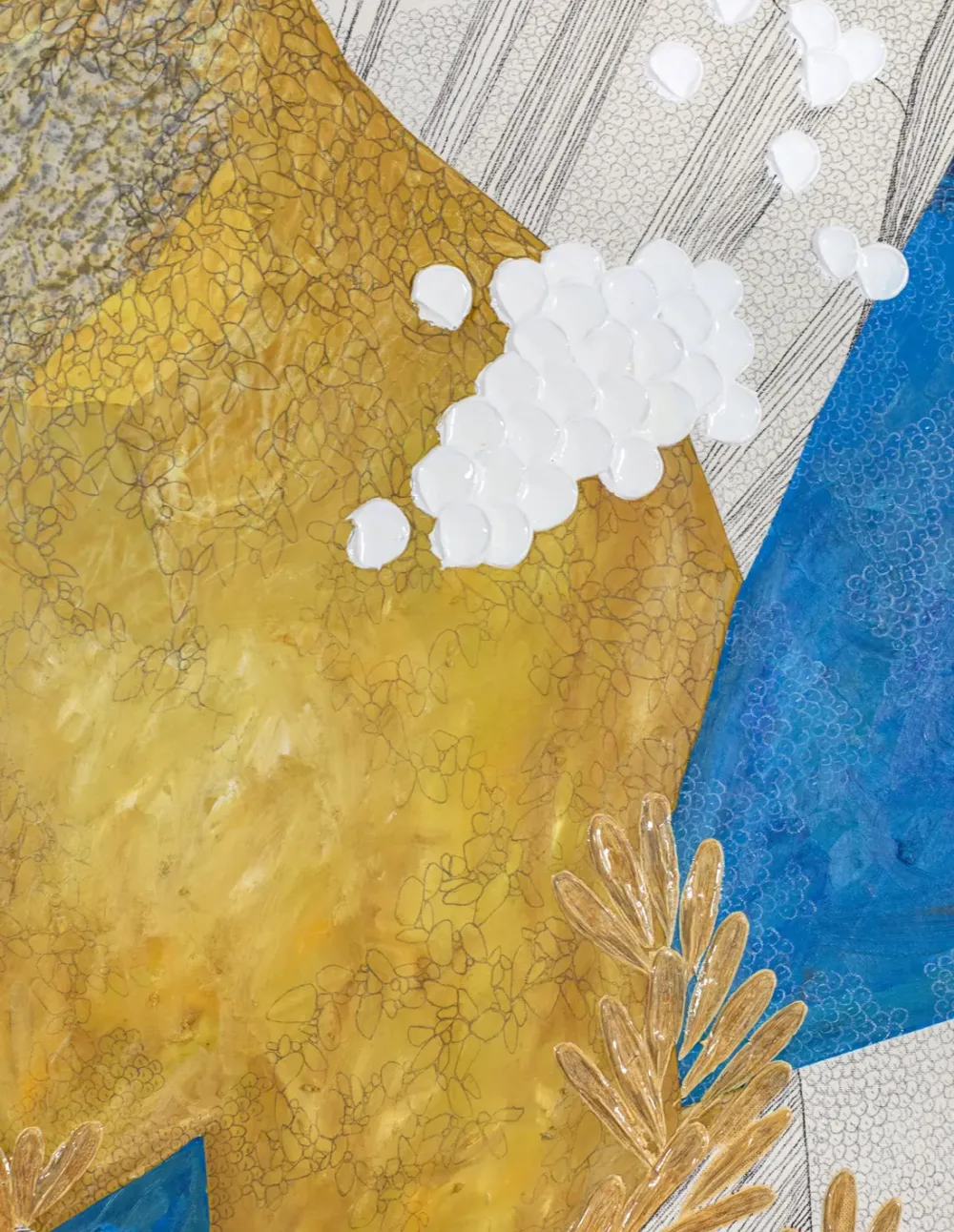 Technique mixte : collage papier, acrylique, posca, pastels à l’huile et crayon papier sur toile