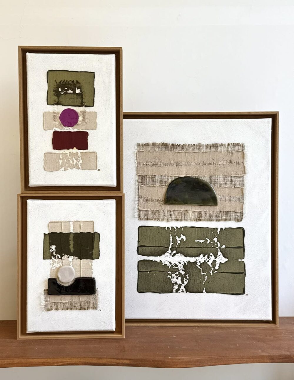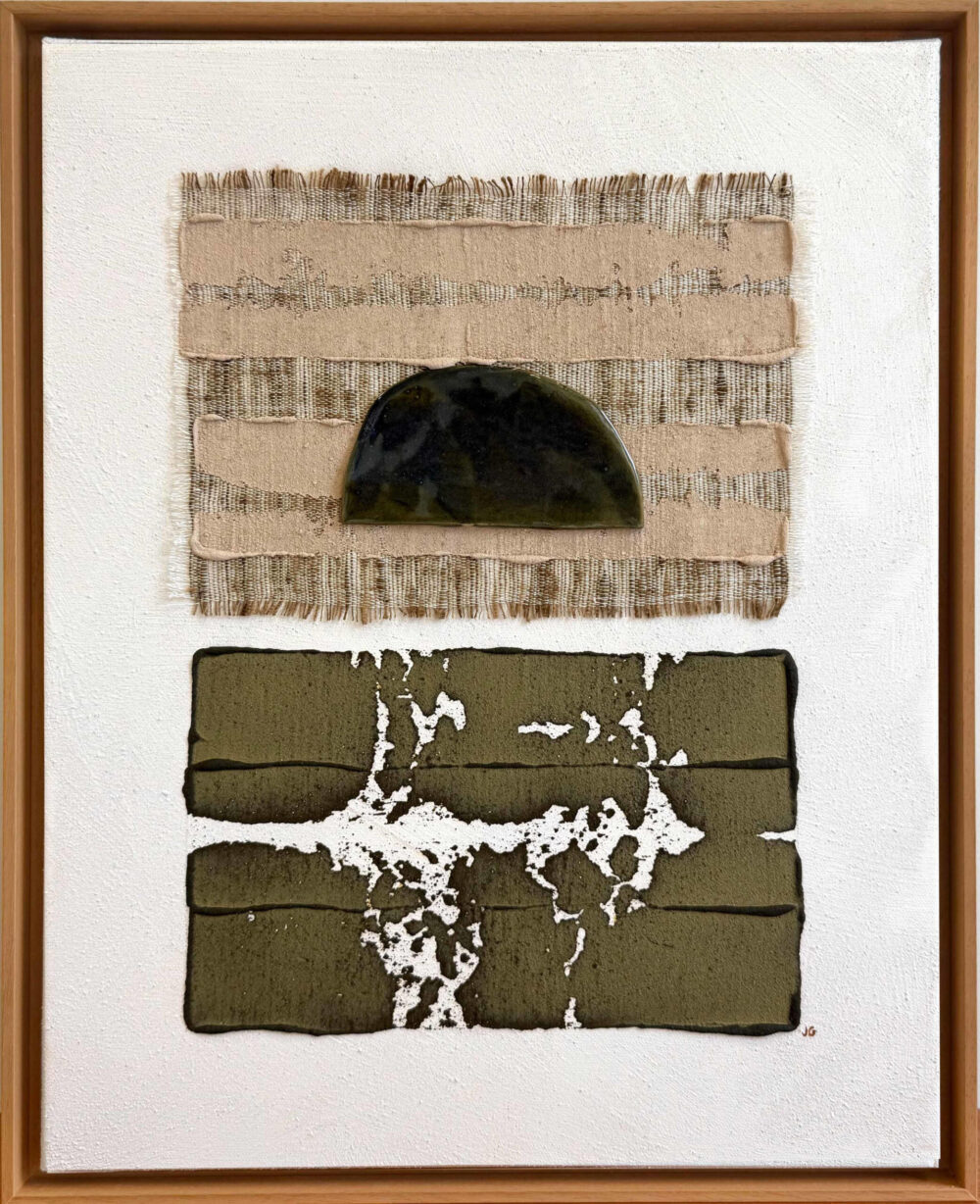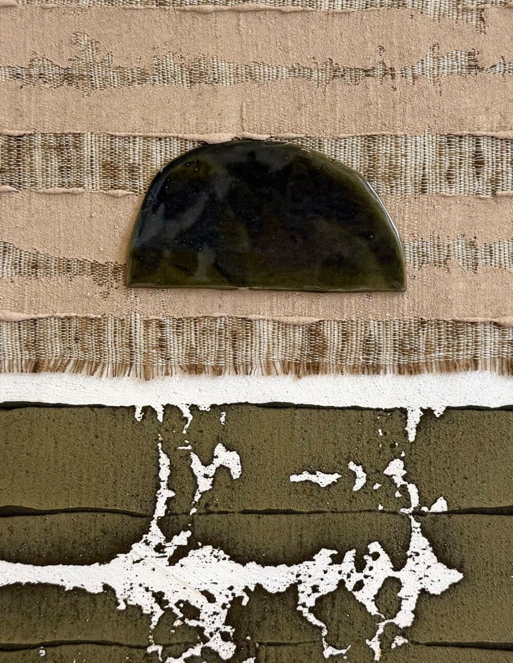 Peinture à la chaux et acrylique, soie sauvage, pièce de céramique unique, eau de mer & sable de Madagascar sur chassis entoilé.