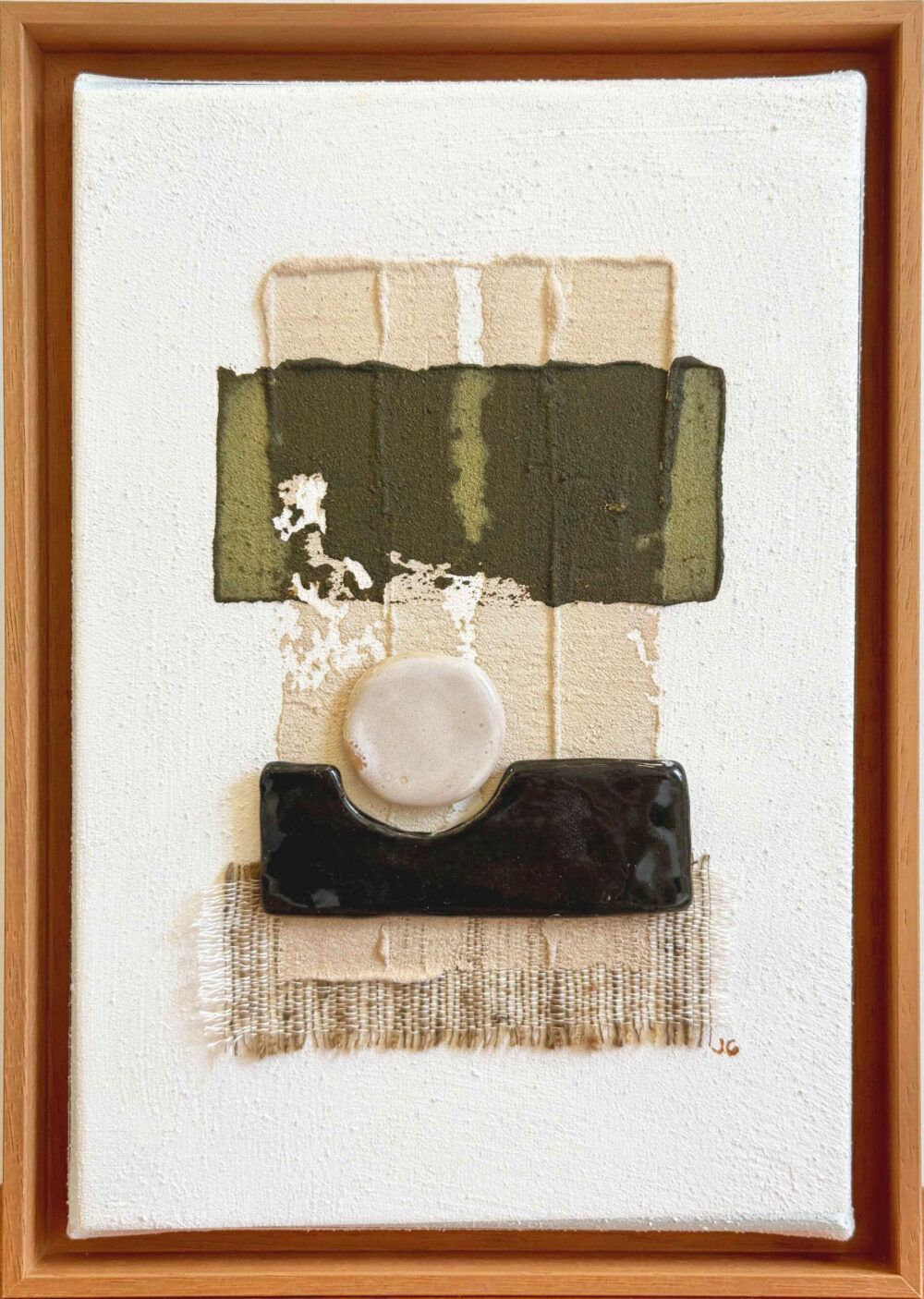 Peinture à la chaux et acrylique, pièce en céramique unique réalisée par l’artiste, soie sauvage, eau de mer & sable de Madagascar sur chassis entoilé