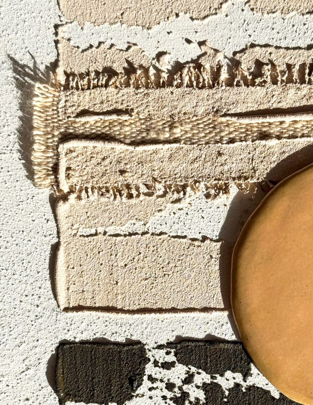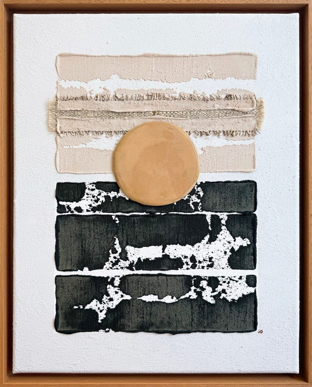 Peinture à la chaux et acrylique, soie sauvage, pièce de céramique unique, eau de mer & sable de Madagascar sur chassis entoilé.