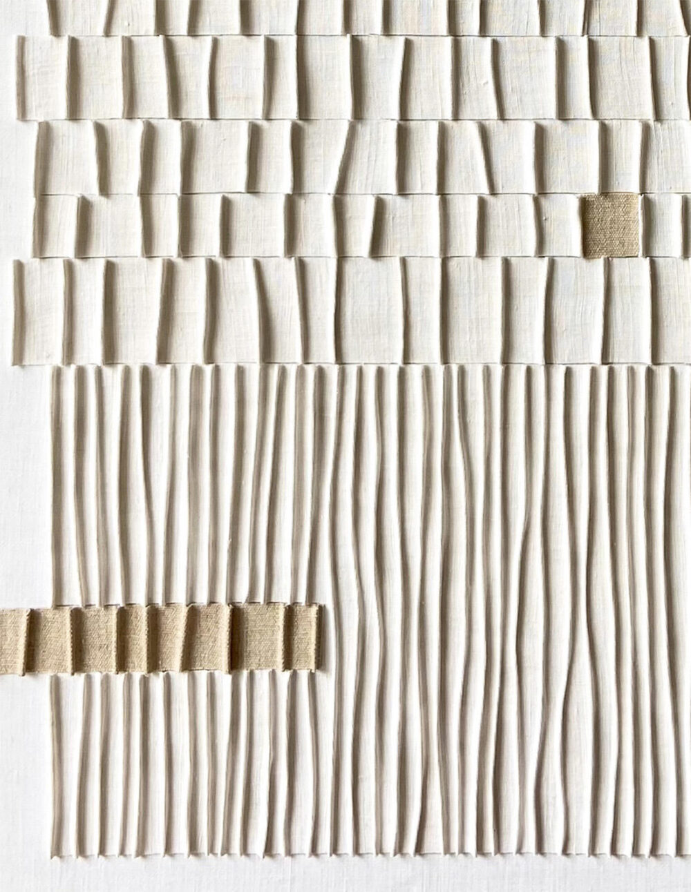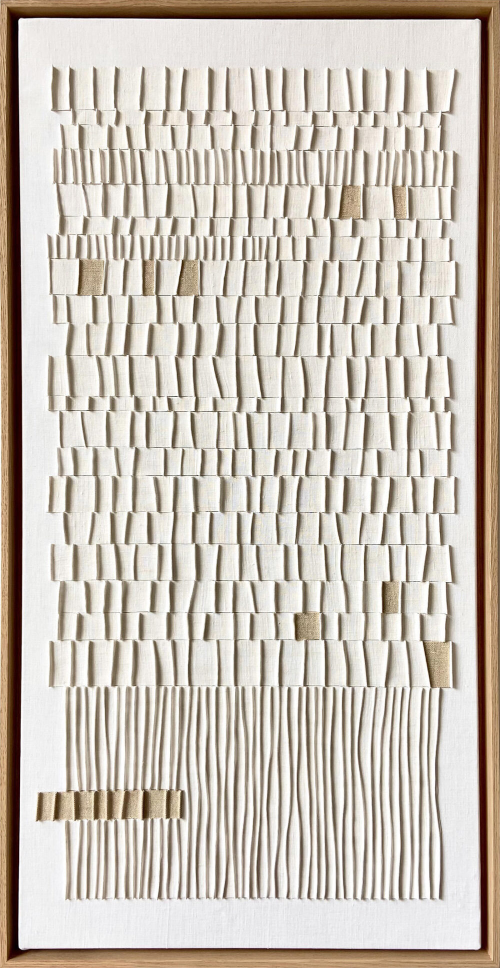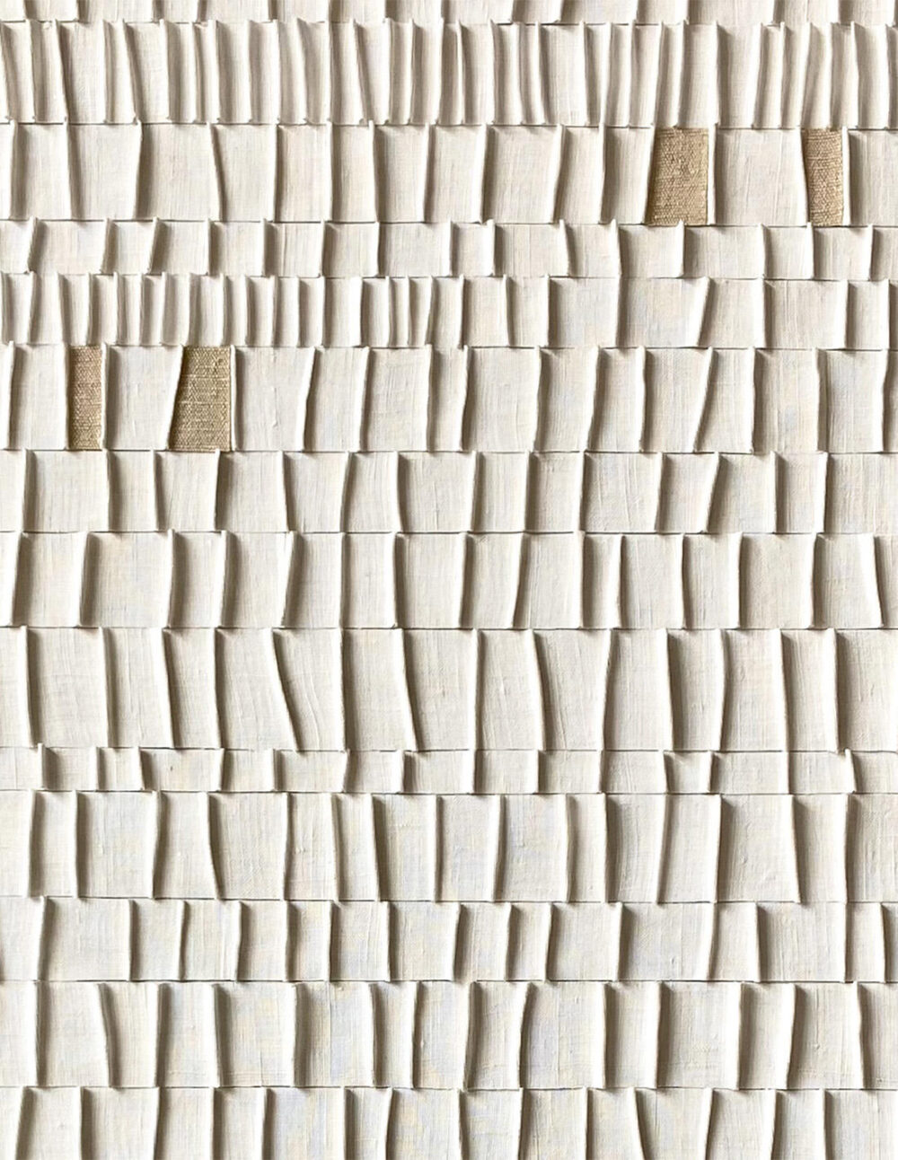 Textiles anciens en lin, gaufrés et empesés, collés sur toile recyclée et châssis bois
