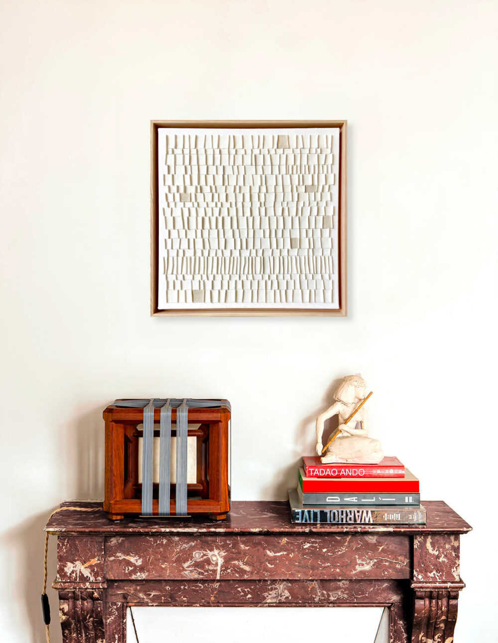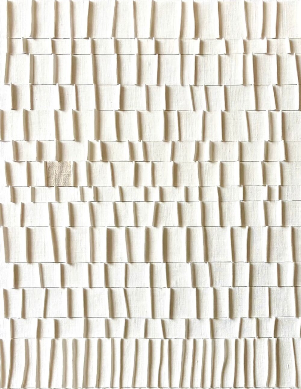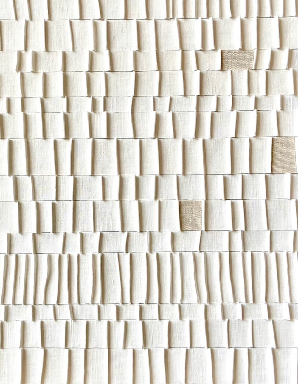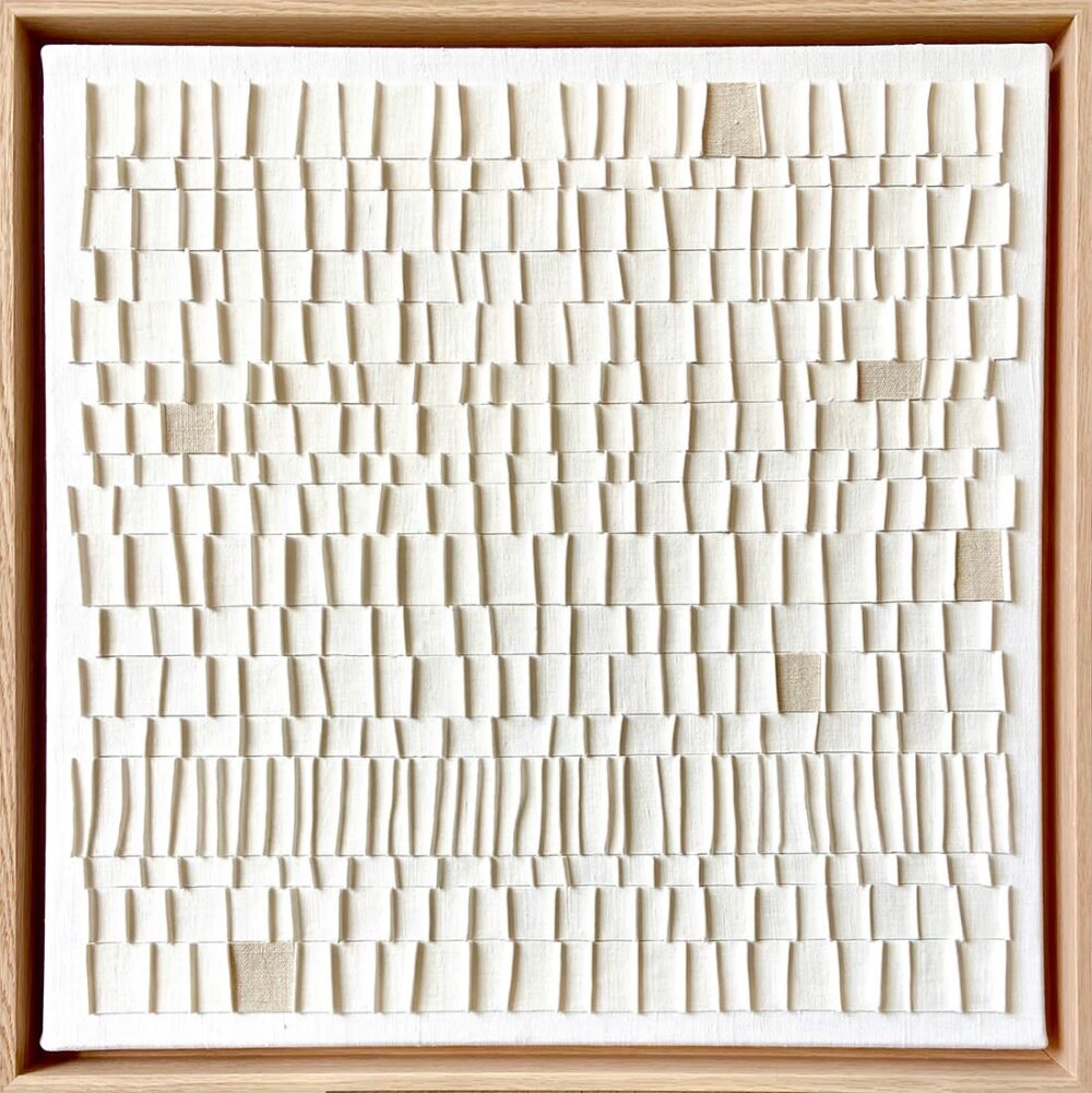 Textiles anciens en lin, gaufrés et empesés, collés sur toile recyclée et châssis bois