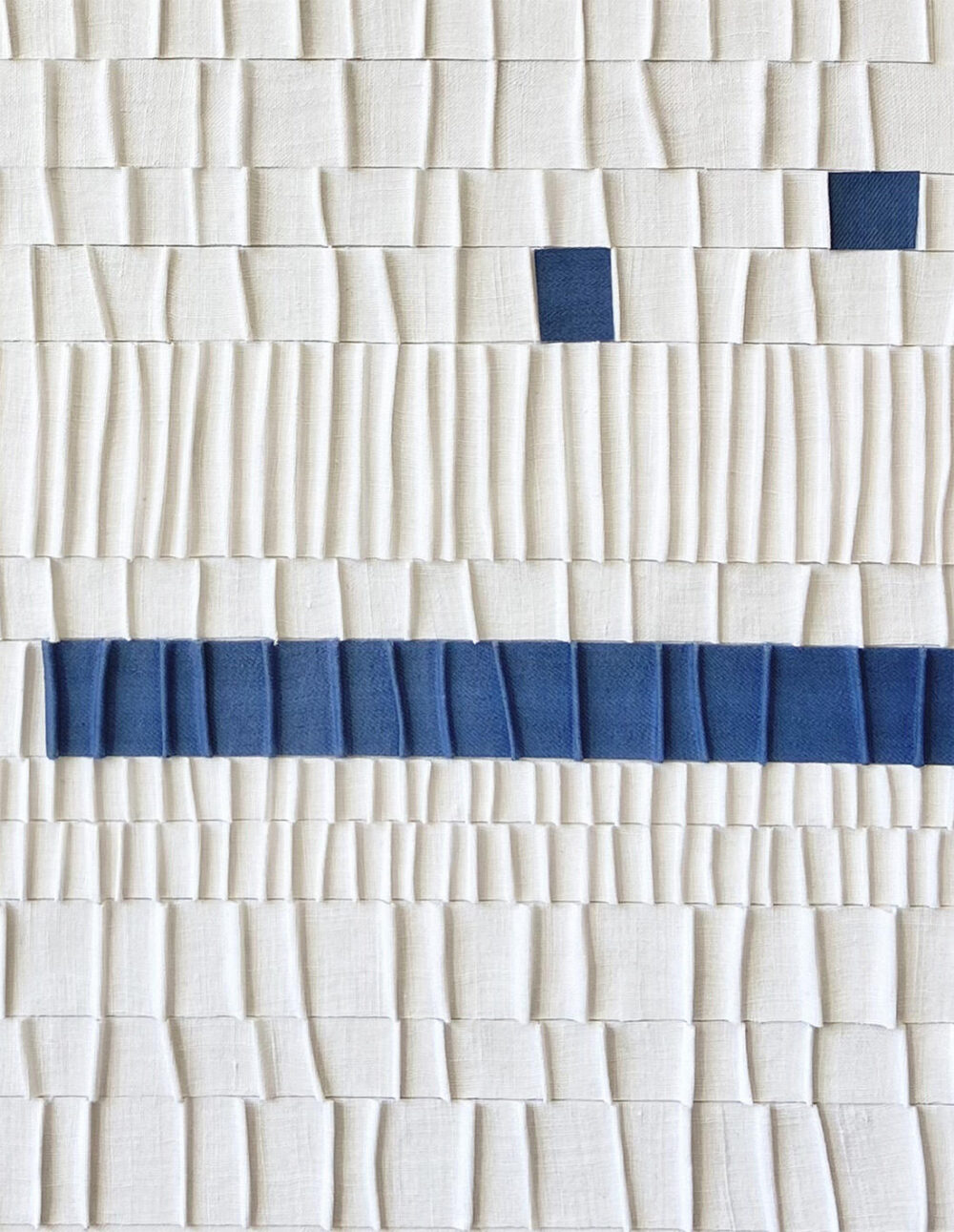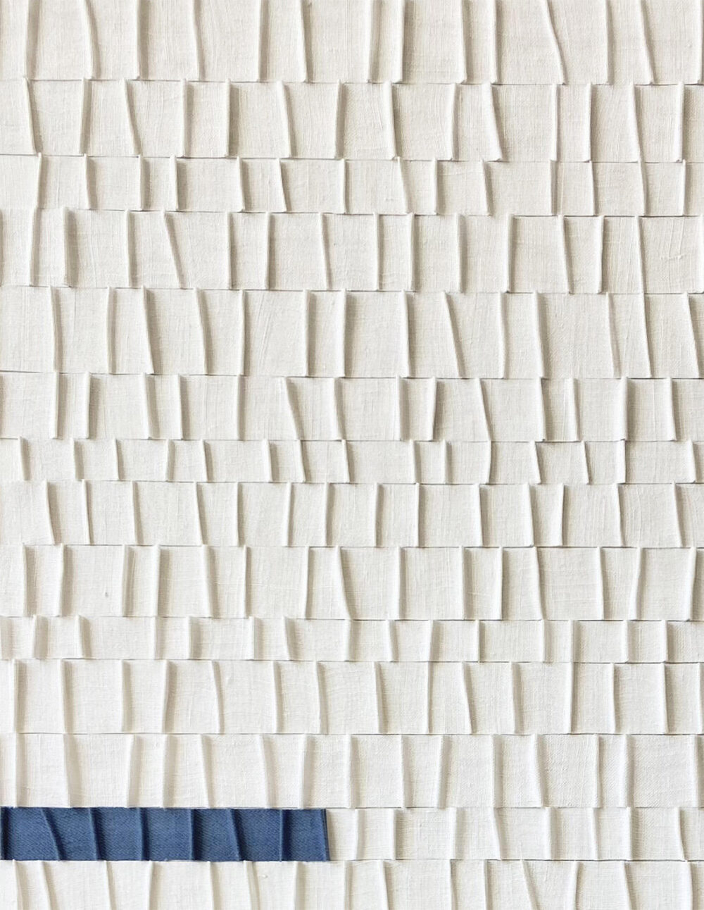 Textiles anciens en lin, gaufrés et empesés, pièces teintées au brou de noix, collés sur toile recyclée et châssis bois
