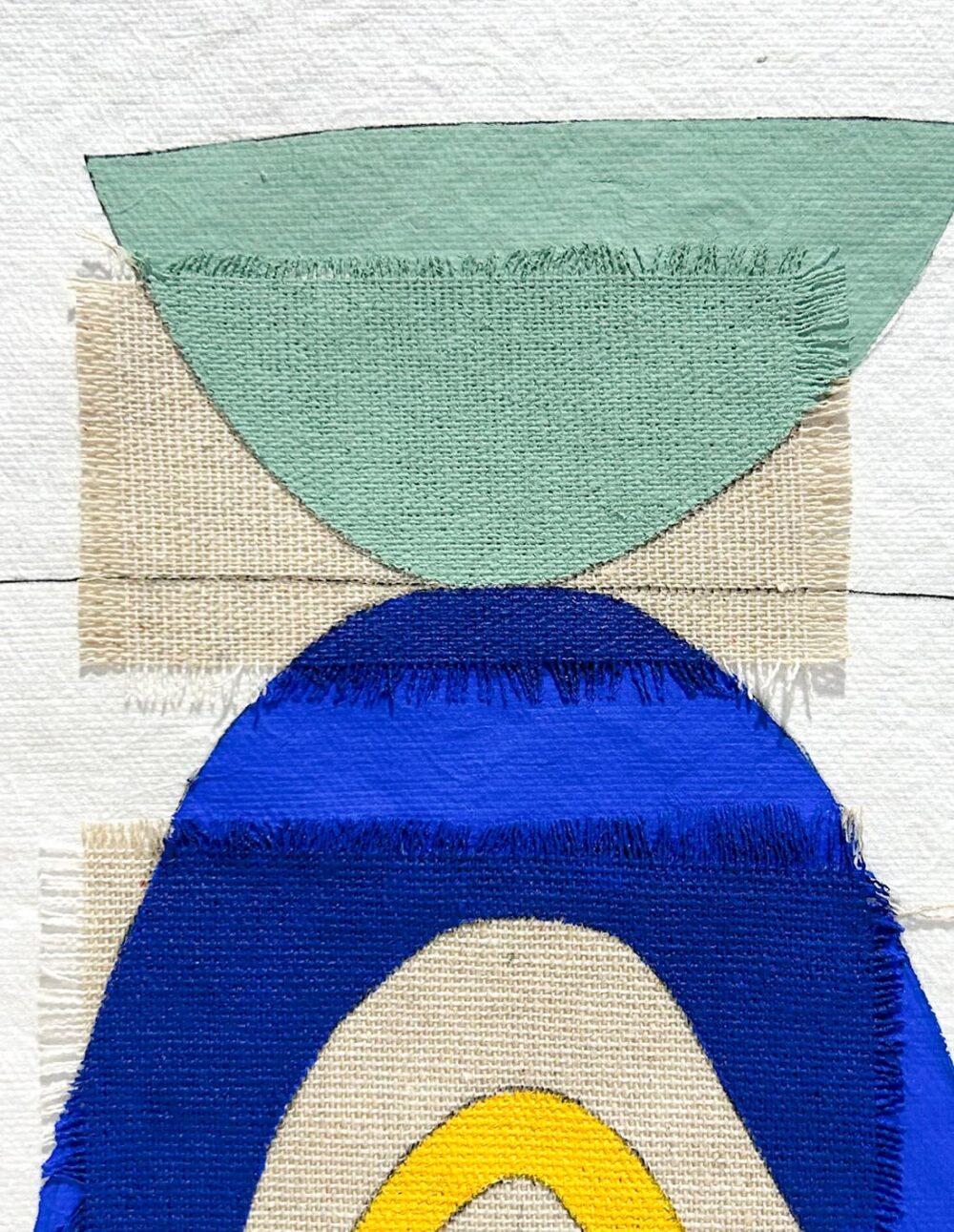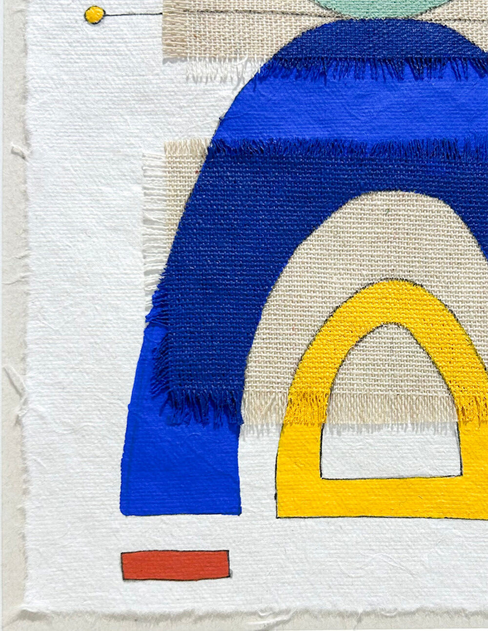 Peinture acrylique, crayon et fil de coton cousu sur papier chiffon en coton