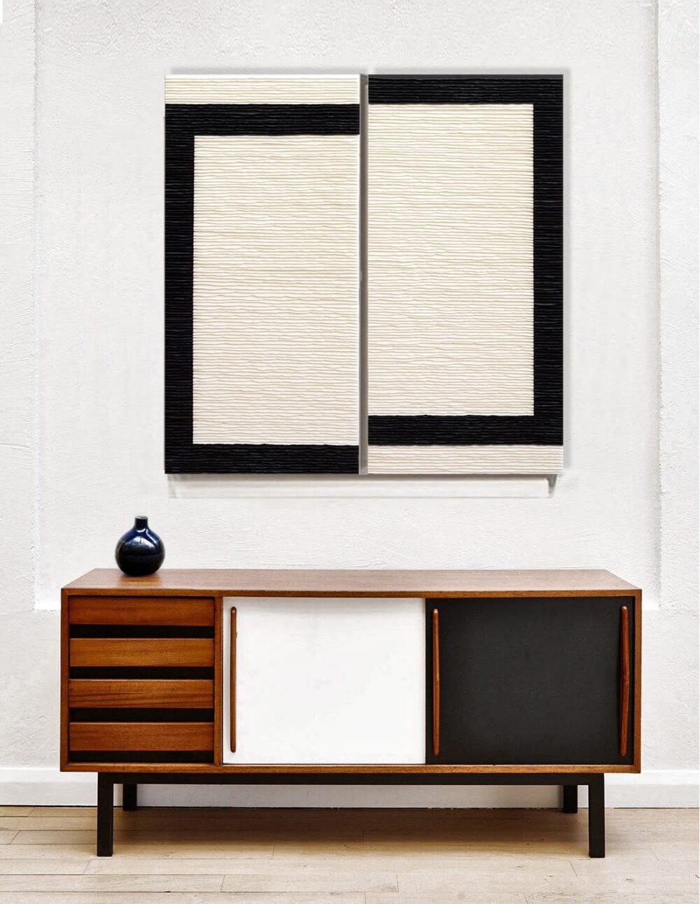Structure noire et blanche sur fond beige / 100 x 100 cm