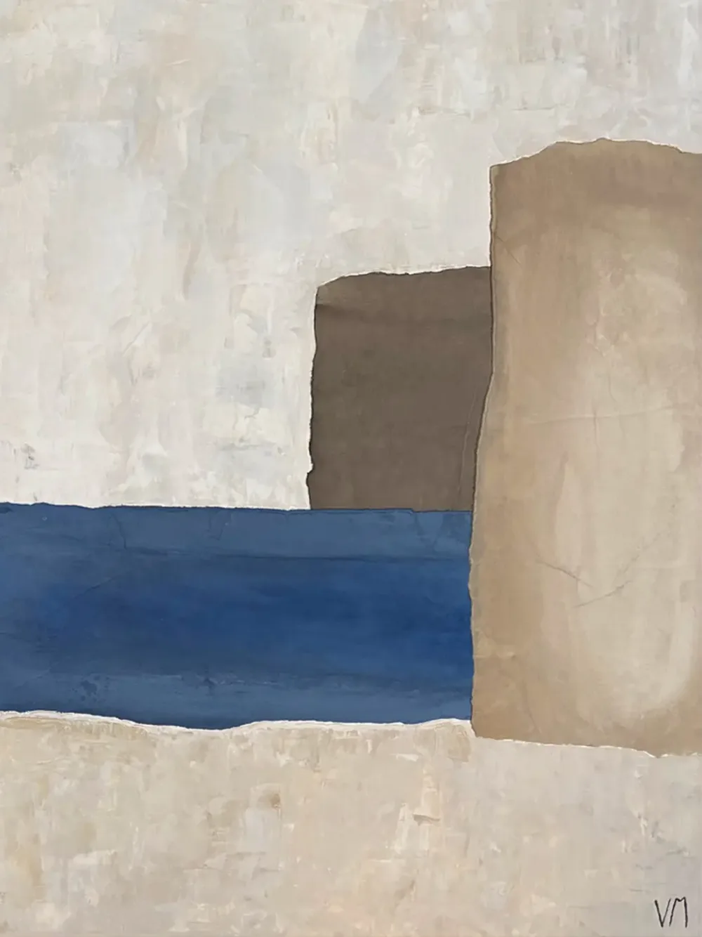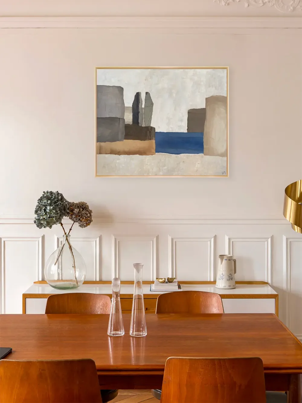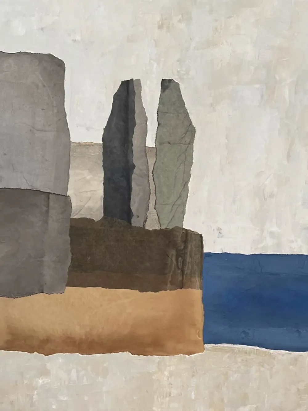 Les tons neutres et l’aspect texturé de ces œuvres s’accordent parfaitement aux matériaux bruts qu’on peut retrouver chez soi : pierres, bois, briques.
